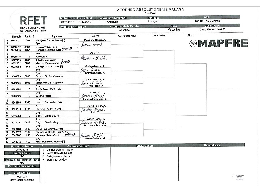 "Campeonato de Andalucía Absoluto de Selecciones Provinciales". Resultados de la primera jornada, cuartos de final: (Almería 1, Málaga 2), (Granada 3, Huelva 0), (Sevilla 2, Cádiz 1). Orden de Juego para la ronda de semifinales, mañana sábado día 23. La primera semifinal la jugaran las selecciones de Jaen VS Málaga a las 17:30h. y la segunda semifinal las selecciones de Sevilla VS Granada a las19:00h.